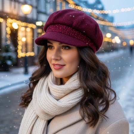 Шапката е налична в четири изискани цвята – лилав, бордо, сиво и розово. Всеки нюанс е подбран така, че да допълва зимните тоалети и да придава индивидуалност на външния вид. Декоративната лента с блестящи камъчета е отличителен детайл, който придава празнично и елегантно усещане, правейки модела подходящ не само за ежедневието, но и за специални поводи.
