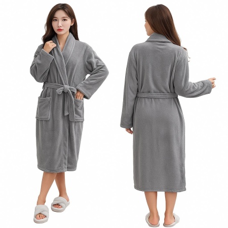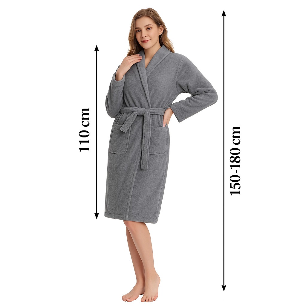 Изработен от висококачествен полиестер, този дамски халат е изключително мек на допир и топъл, което го прави идеален за по-хладни сезони или за хора, които ценят уюта. Материалът е лек, дишащ и бързосъхнещ, предотвратявайки усещане за тежест или прегряване. Сивото цветово решение придава елегантен и неутрален вид, който се съчетава лесно с всякакъв интериор или личен стил, като същевременно е устойчиво на петна и лесно за поддръжка.