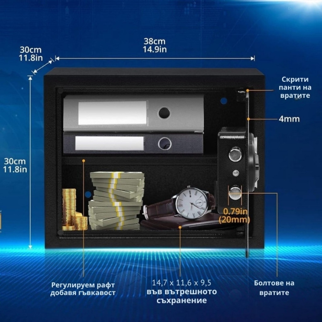 Този електронен сейф съчетава здрава конструкция, модерна технология и практични функции, за да осигури надеждна защита на вашите ценности. Регулируемата полица позволява персонализирано подреждане, а цифровото заключване с аварийни ключове гарантира лесен и сигурен достъп. Със своя стилен дизайн и възможност за монтаж, сейфът е подходящ за всяка среда – от дома до офиса.