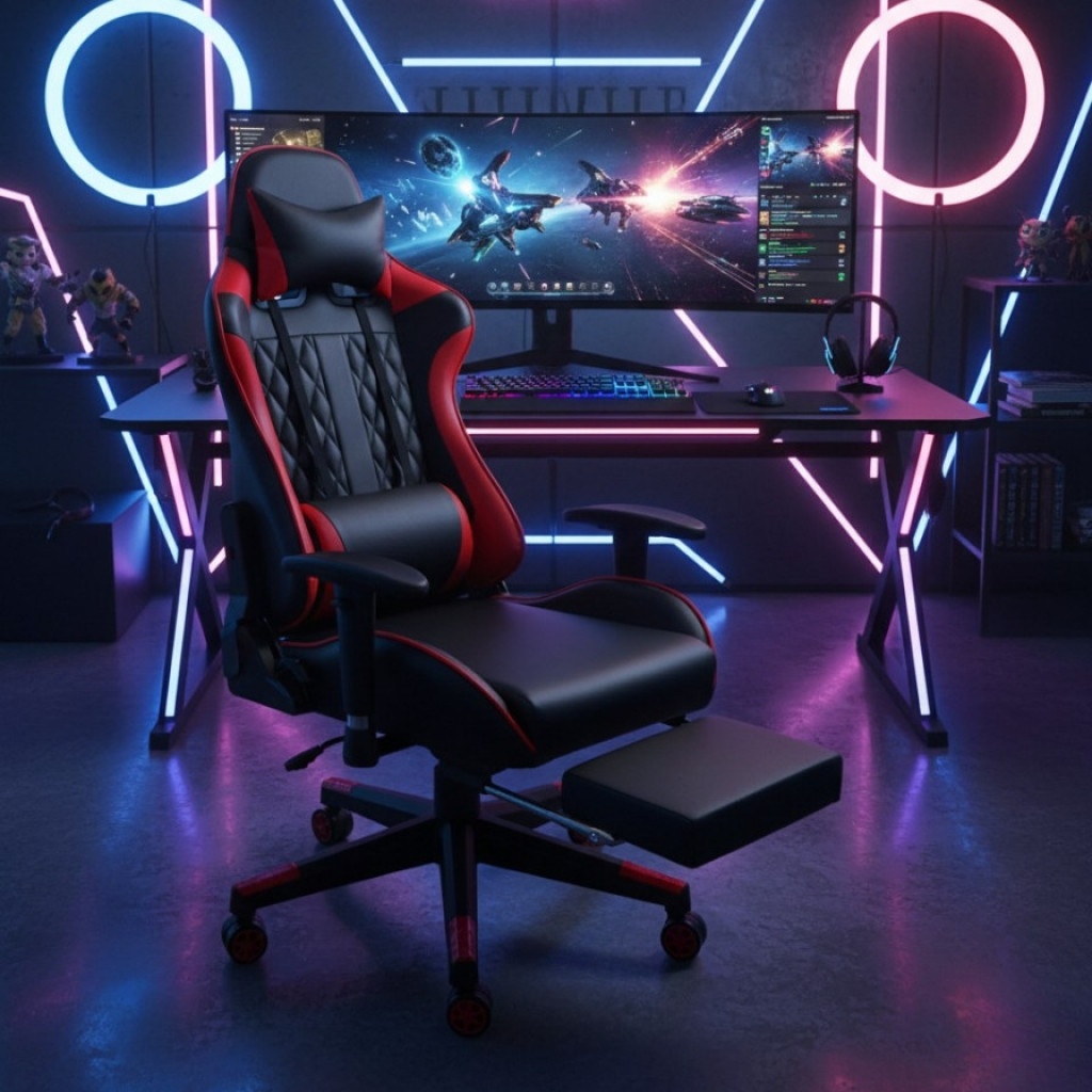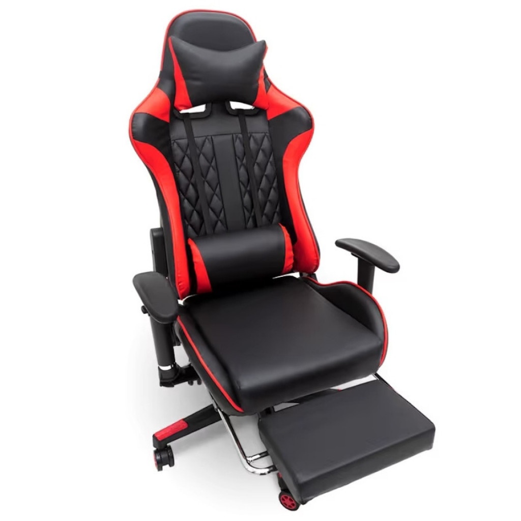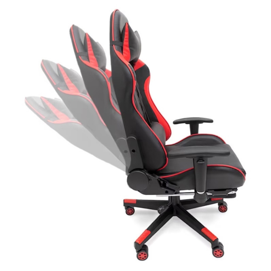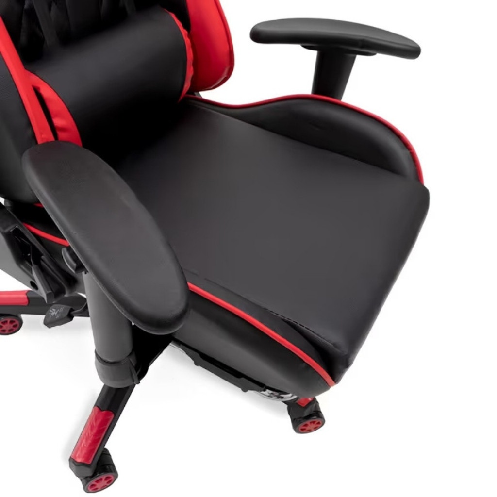 Стилен червен геймърски стол с масажна функция, регулируеми елементи и прибираща се подложка за крака – максимален комфорт за дълги часове гейминг или работа без болки