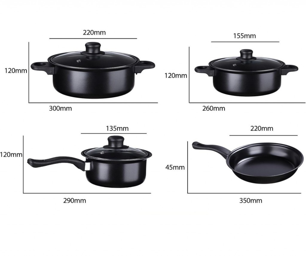 Комплектът съдове за готвене е изработен от висококачествена желязна сплав с незалепващо покритие отвътре. Той включва капак от закалено стъкло и топлоизолирани дръжки, които осигуряват безопасност и комфорт при употреба. Със своя класически черен външен вид, този комплект е стилен и лесен за употреба.