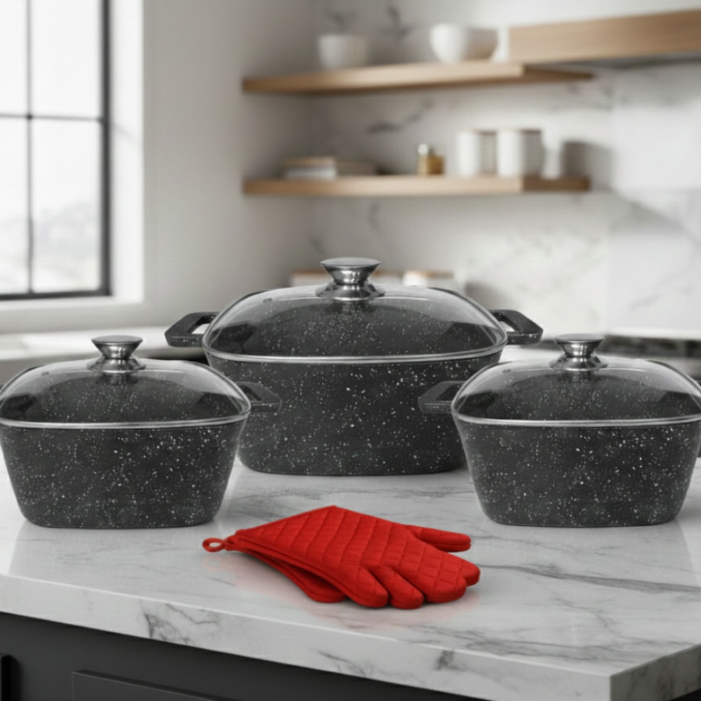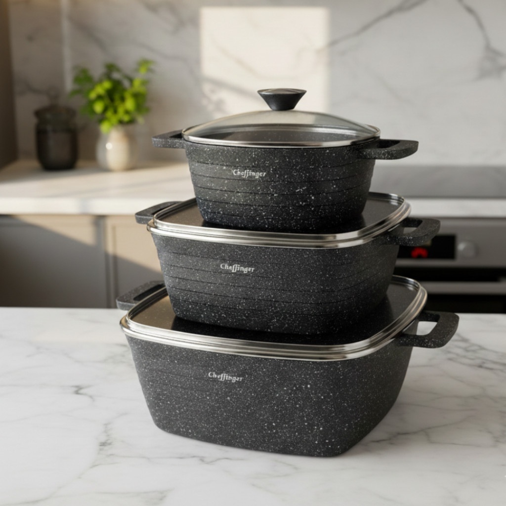 Премиум комплект тенджери Cheffinger от лят алуминий с трислойно мраморно незалепващо покритие. Осигуряват равномерно нагряване, висока издръжливост и лесно почистване. Подходящи за всички видове котлони, включително индукционни.