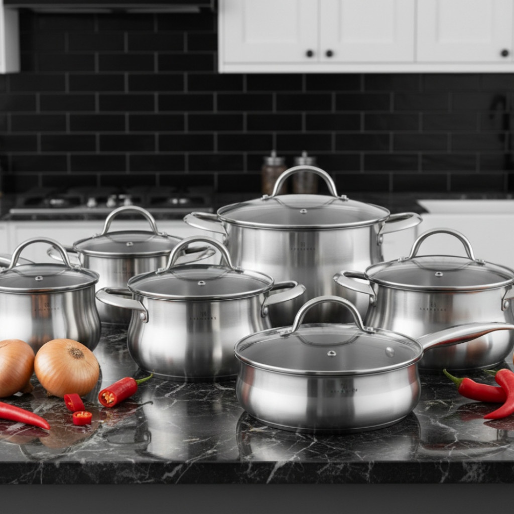 - Закалени стъклени капаци – с отвор за пара за по‑добър контрол по време на готвене.