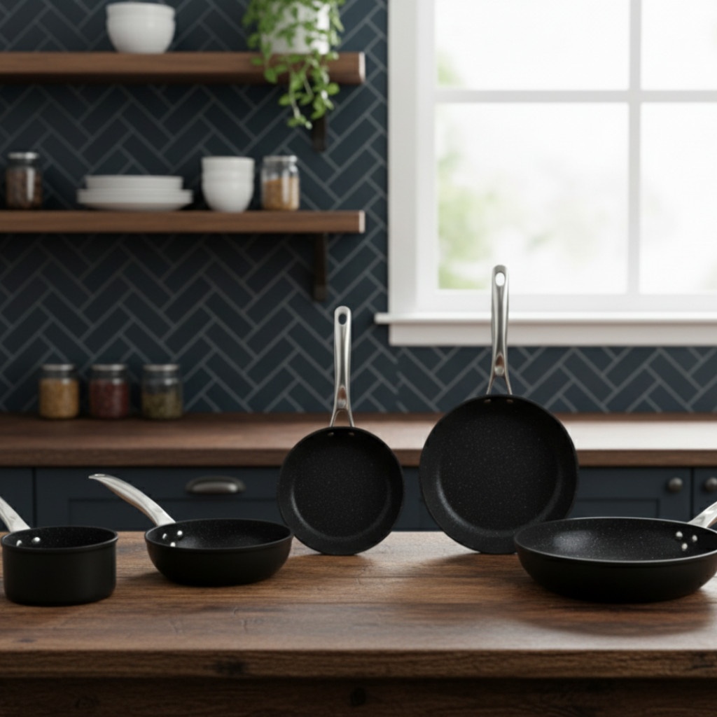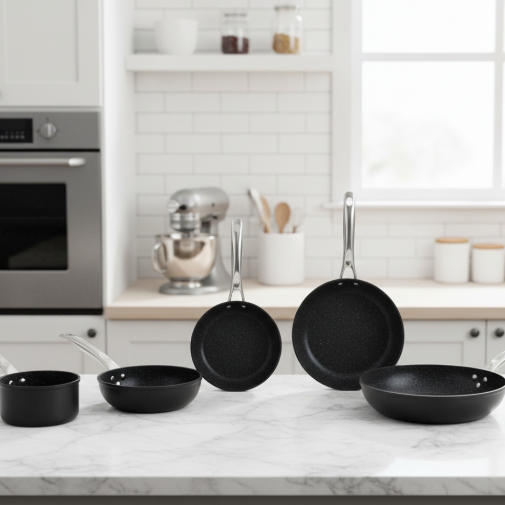 Със своето иновативно мраморно незалепващо покритие, този набор елиминира проблема с лепенето и загарянето на храната, позволявайки по-бързо и по-здравословно готвене с минимална мазнина.