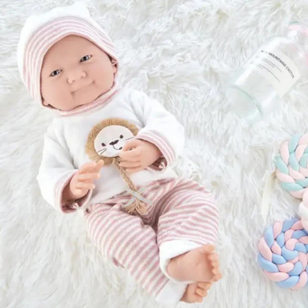 - Дизайн: Реалистично лице с меки черти, меко тяло за гушкане, удобни дрешки (розов или сив комплект)