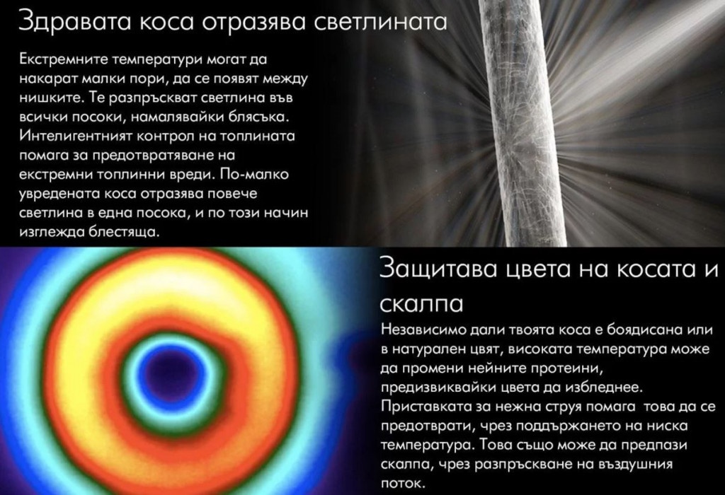 Йонизираща функция: Намалява статичното електричество и придава блясък на косата.