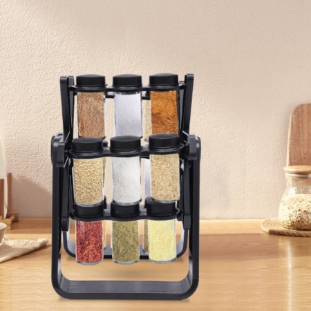Изработен от висококачествено стъкло и оборудван с въртяща се поставка, органайзерът демонстрира изключителна здравина и стилов акцент. Компактният му дизайн – с размери на стойката от 23 см дължина и 34 см височина, както и бурканчета с диаметър 5 см и височина 9,5 см – го прави практичен избор за всяка кухня, без да заема излишно място. Комбинацията от прозрачни бурканчета и елегантни черни детайли придава съвременен вид, докато ABS капаците подсигуряват оптимално запазване на аромата и качеството на подправките.