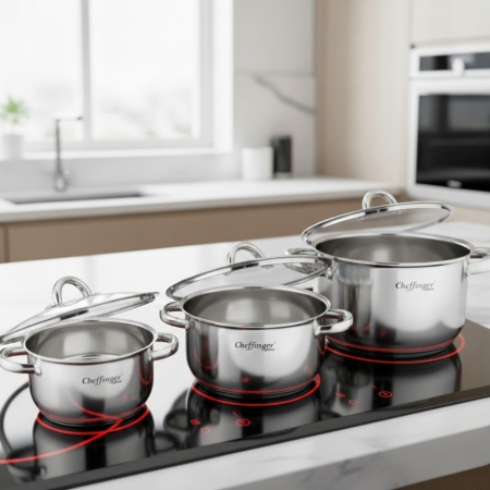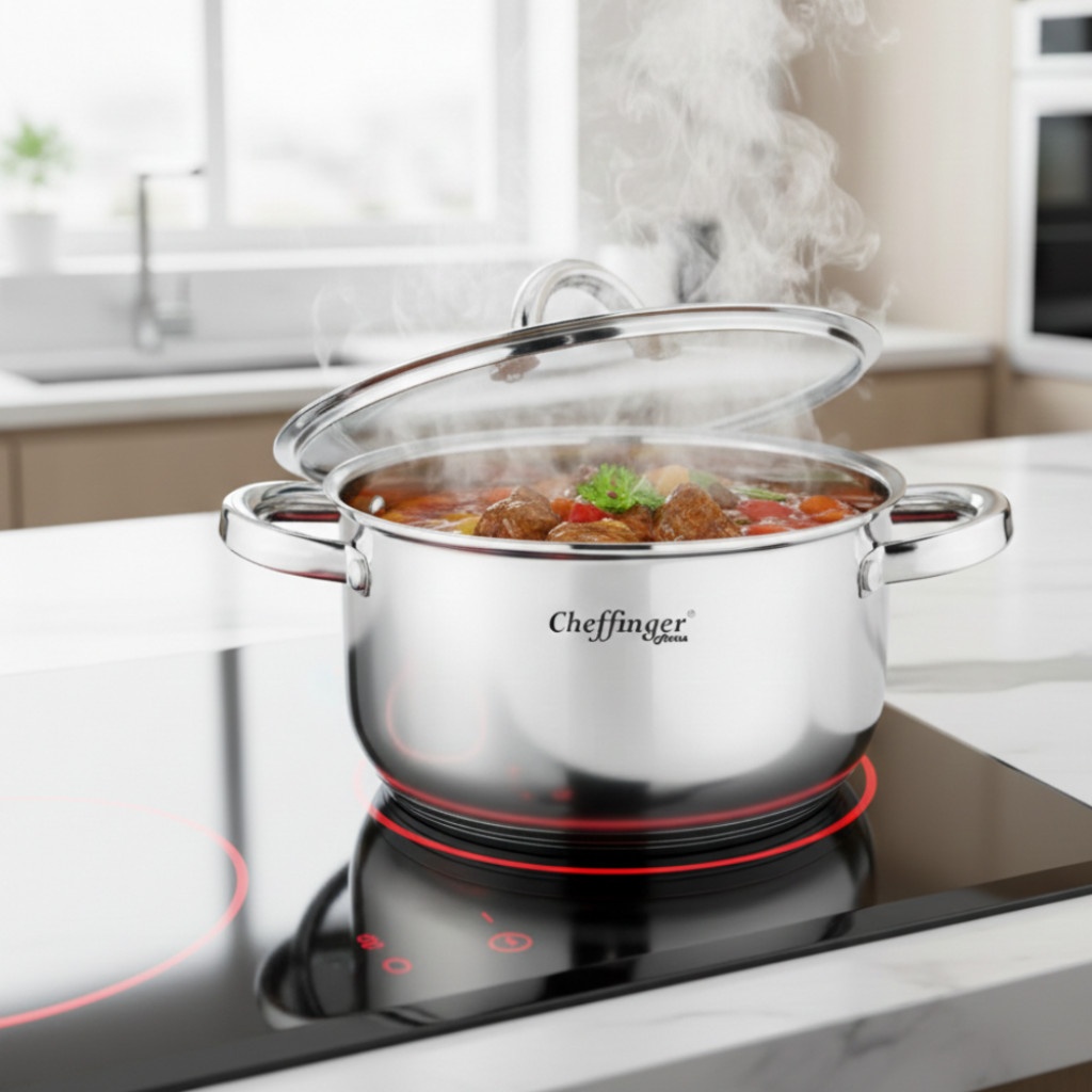 Ключовото предимство на тенджерите Cheffinger е тяхното многослойно индукционно дъно. То осигурява светкавично загряване и оптимално, равномерно разпределение на топлината по цялата повърхност. Това предотвратява загарянето на храната в определени зони и позволява готвене с по-малко енергия.