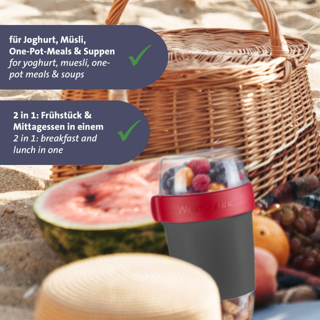 Насладете се на свежа и вкусна закуска навсякъде с тази удобна чаша за мюсли! Тя разполага с две отделни, устойчиви на разливане отделения, които ви позволяват да съхранявате корнфлейкс, мюсли, супа, каша или кисело мляко без притеснение. С капацитет от 700 мл, тя е достатъчно голяма за пълноценен обяд или закуска в движение. Благодарение на висококачествените материали, чашата е безопасна за използване в микровълнова фурна и фризер, което я прави изключително удобна за ежедневна употреба.